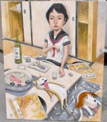 今回、私が出品した作品はF20号「四畳半ブルース」とF3号「午睡」の2点です。(全作家、20号と3号の2点出品)