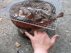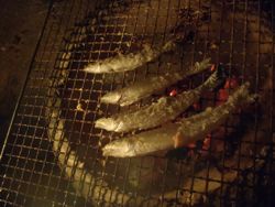 七輪の火力が安定して来たので捌いた魚を網の上へ・・・