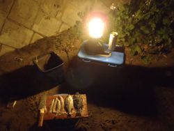 ランタンの灯りを頼りに捌いた魚に塩をふります。